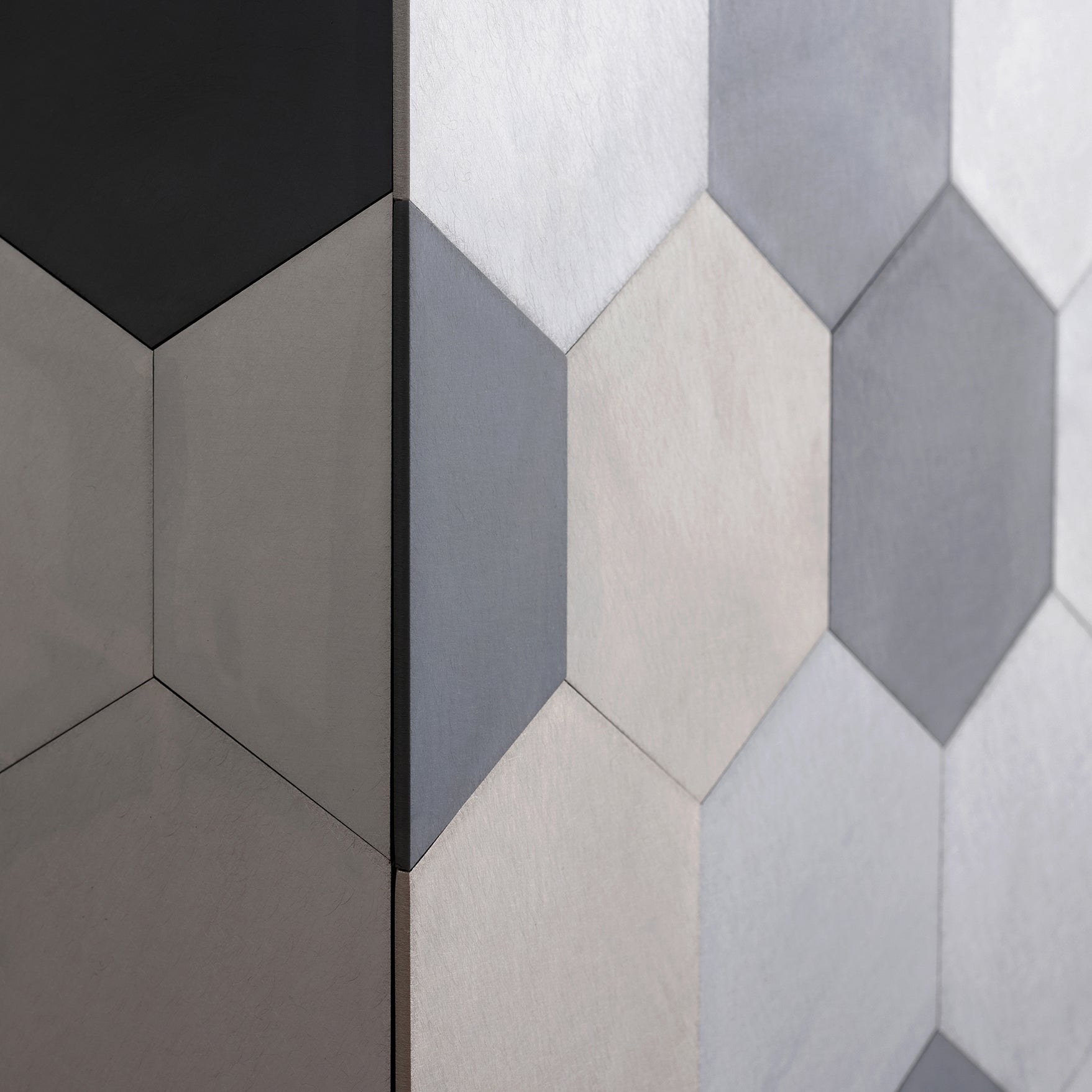 通常の石や陶器のタイルは厚みが最薄でも9㎜程度ありますが、アルミタイルは3㎜の薄さが実現可能です。薄さ3mmかつ、断面にもアルマイト処理を施してあるため、出隅の処理に見切り材や塗装の必要はなく、美しく仕上がります。